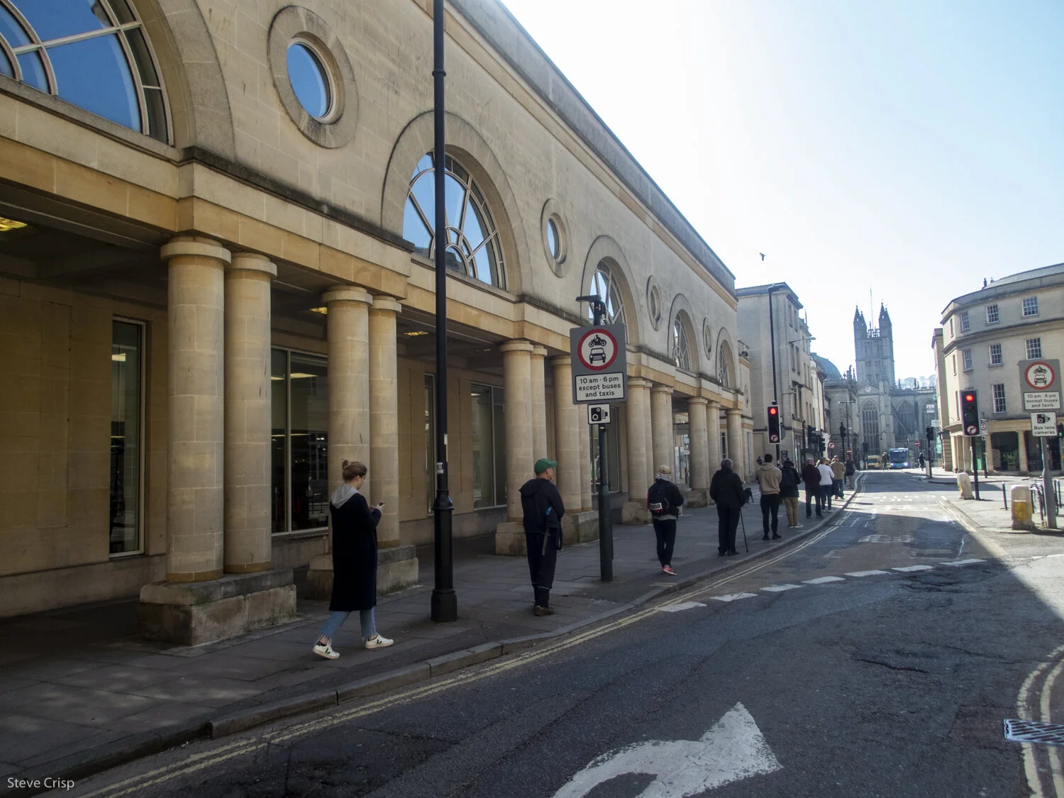 A Bath street scene including newly erected barriers during COVID-19 lockdown.