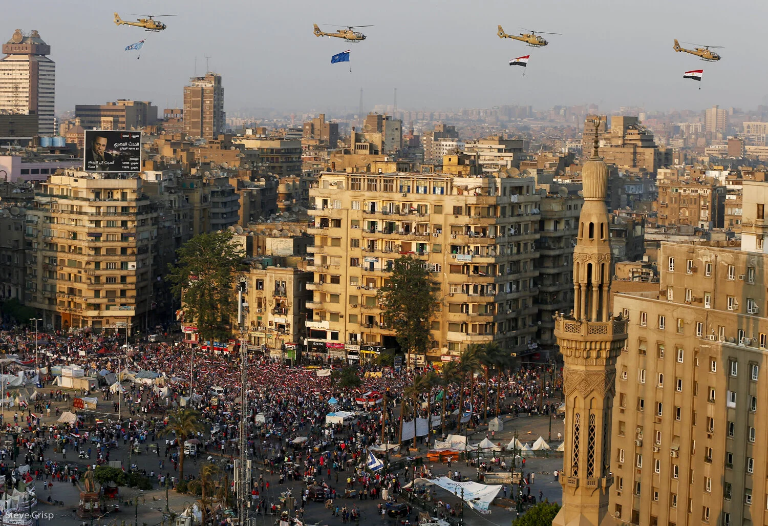 A view shows a fly-past over protesters against ousted Egyptian President Mohamed Mursi, in Tahrir Square in Cairo July 4, 2013. The leader of the Muslim Brotherhood was arrested by Egyptian security forces on Thursday in a crackdown against the Is